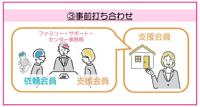 指定した日程に、依頼会員とそのお子さん、支援会員、センター事務局の職員で打合せを行います。